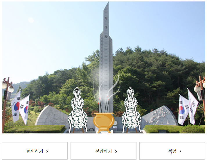 아래 그림을 클릭하신 후 헌화하기 -> 분향하기 -> 묵념 순으로 클릭만 하시면 순차적으로 화면이 바뀌면서 참배가 이루어집니다.