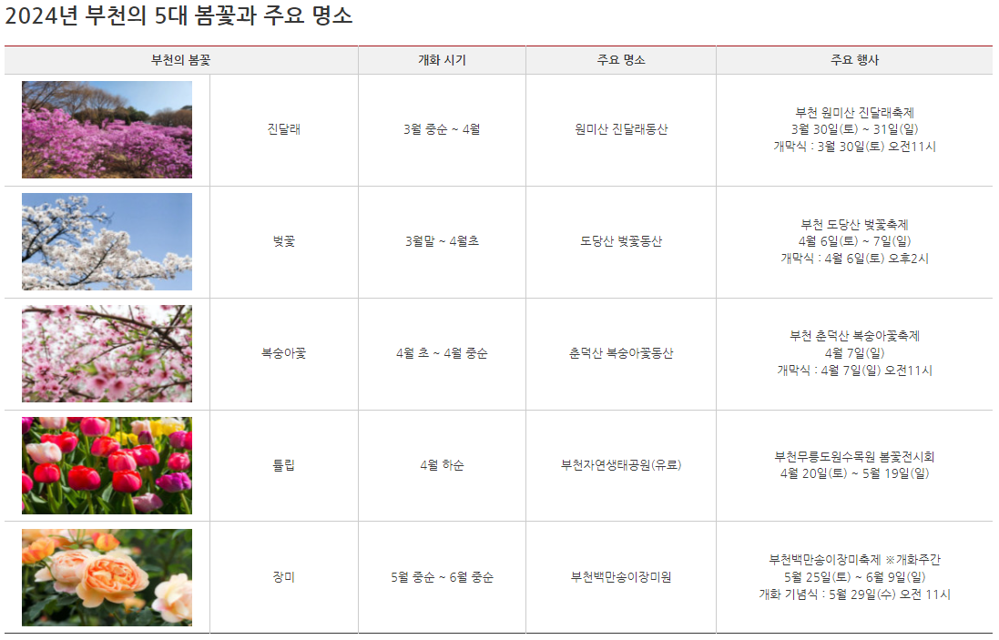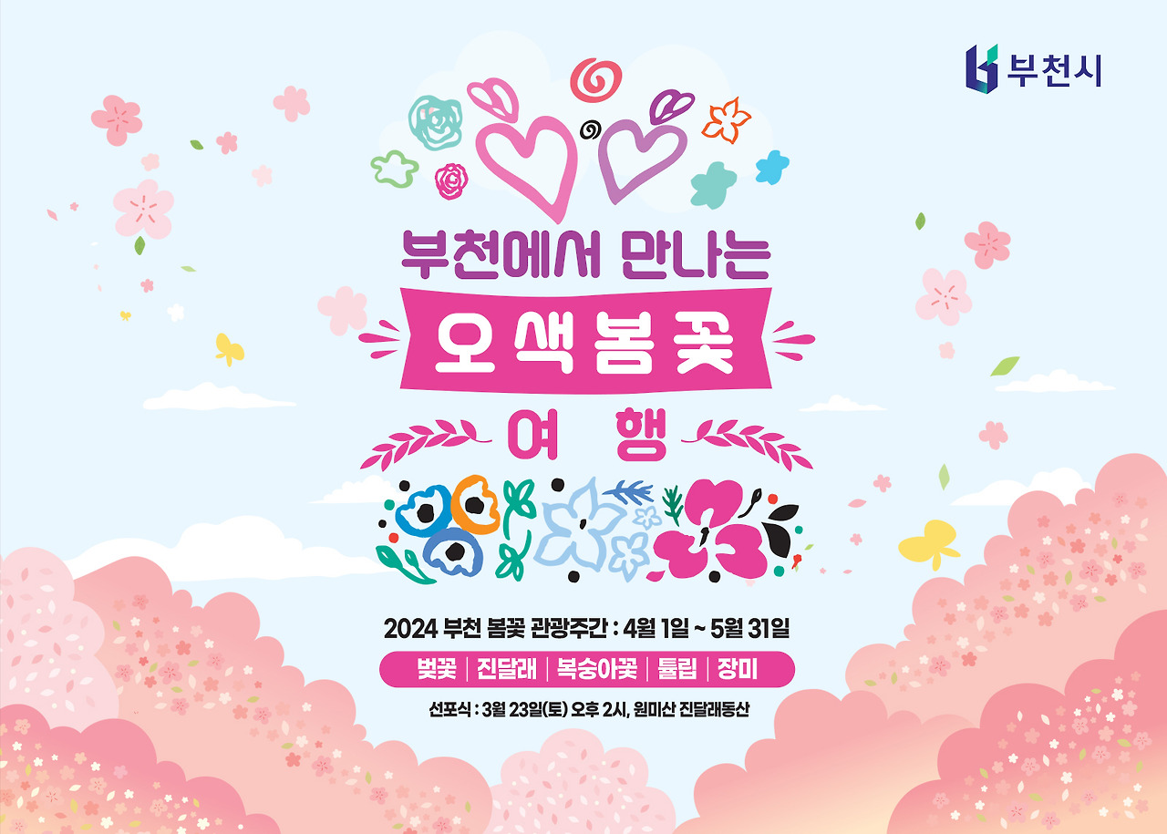 | 행사 내용 | 선포식 일시 : 2024년 3월 23일(토) 오후 2시~4시 선포식 장소 : 원미산 진달래동산 야외무대 내 용 : 봄꽃 관광주간 선포 세레머니, 봄꽃 특화 프로그램, 축하공연 축하공연 : 불타는 트롯맨 TOP4 김중연, 이미희필무용단, 베니앤프렌즈 특별게스트 : 배우 예지원 |
