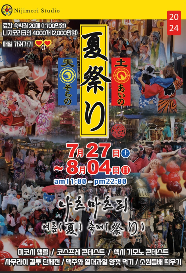 | 행사 내용 | 1. 이용시간; OPEN 11:00 ~ CLOSED 21:30 / 입장마감 20:00 2. "나츠마츠리" 행사 프로그램 정보 -미코시행렬 (퍼레이드) -핫기모노 콘테스트 -코스프레 콘테스트 -맥주 마시기 대회 (비루쇼부) -밴드 공연까지 색다른 축제를 즐겨보세요. ※ 사무라이결투는 입장손님들이 아이노 vs 소라노 가문중 하나를 선택하여 둘로 나뉘어 이뤄지는 다양한 게임의 한 종류 이다. ※ 핫기모노&코스프레 콘테스트는 손님들의 적극적인 참여가 필요하다. 손님들이 기모노, 코스튬과 같은 옷들을 입고 런웨이를 하며 참여한 손님들에게 간단히 순위를 매겨 작은 선물들을 준비해 드리는 참여형 축제 이벤트이다. 3. 시상 각 콘테스트당 대상 : 료칸 숙박권 금상 : 니지모리 프리패스 (무료입장권) 은상 : 니지모리 코인 (니지모리스튜디오에서 사용가능한 현금성 코인) ※ 매일 발표하는 시상~ (매일 상품이 제공됩니다) 4. 부대시설 히카리잡화점, 선물샵(도자기점), 니지라멘, 모리야(스시집), 모리마트, 의상실(기모노대여점), 아이노팡야(커피숍), 오락장, 카메사케(이자카야), 료칸, 레스토랑, 오다사진관, 고이비토요(LP바), 니코책방, 우마이야타이 등 |
