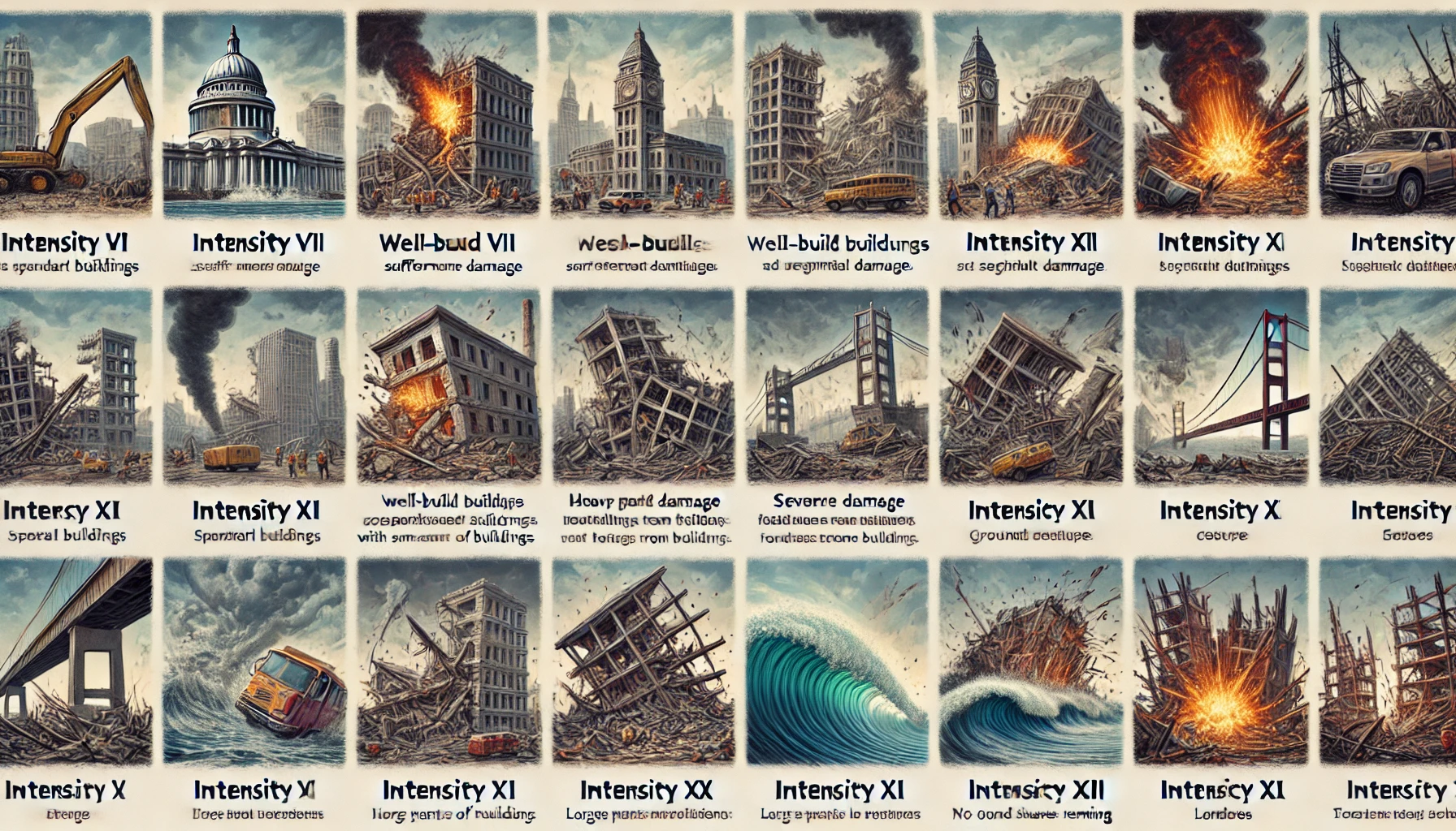 | XI | 전면적 피해. 서 있는 건물이 거의 없음. 다리 파괴. 땅에 넓은 균열 발생. 레일이 크게 휘어짐. 땅에서 파도가 관찰됨. |