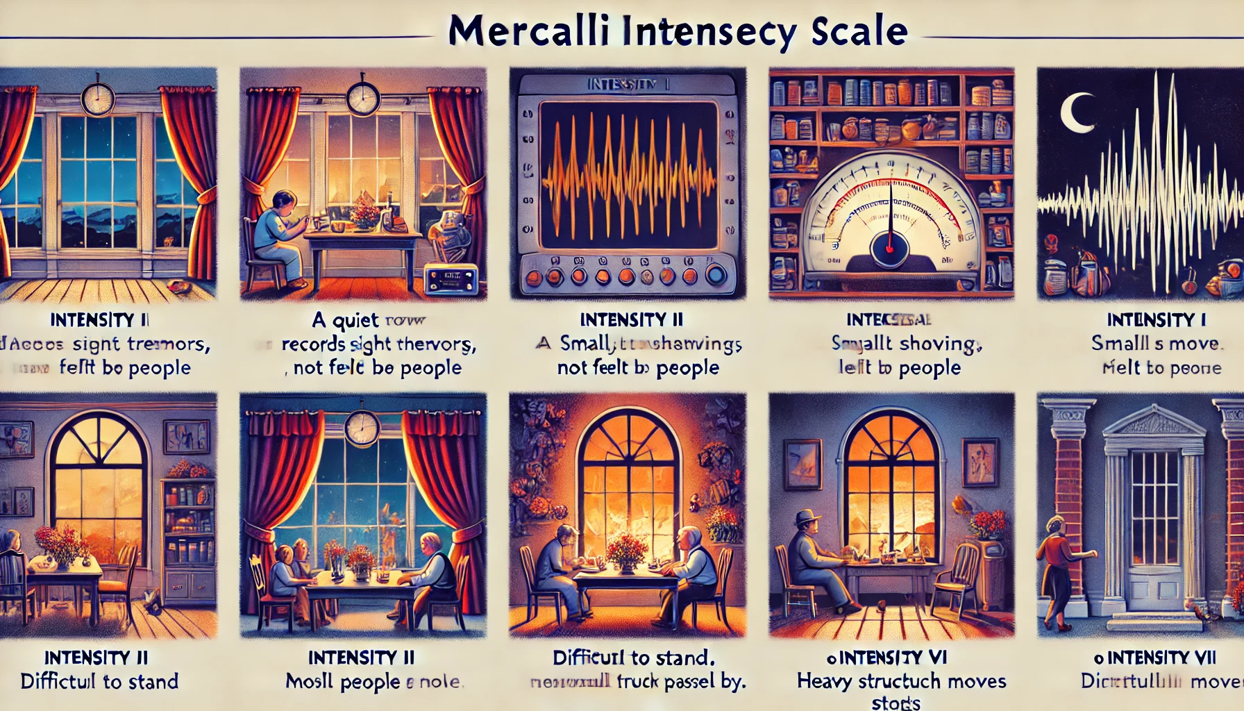 Mercalli 강도 척도는 지진이 미치는 영향을 기준으로 지진의 강도를 평가하는 방법입니다. 이는 리히터 규모나 모멘트 크기 척도와는 달리, 객관적인 진폭이나 모멘트를 측정하는 것이 아니라 사람들이 체감하는 지진의 강도를 기준으로 등급을 매깁니다. Mercalli 강도 척도는 다음과 같이 나눌 수 있습니다.