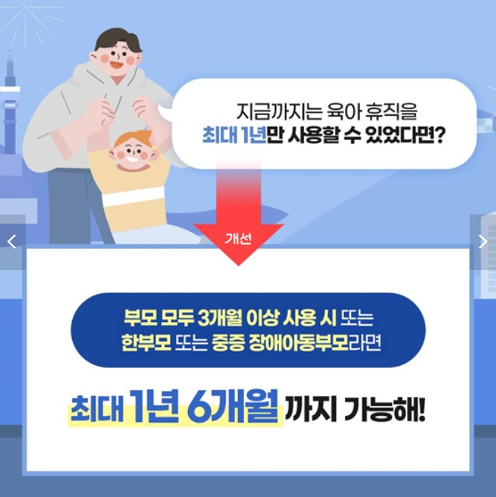 ■ 맞벌이 부부의 육아휴직 기간 확대: 부모가 각각 육아휴직을 3개월 이상 사용하는 경우, 기존 1년에서 1년 6개월로 연장하여 사용할 수 있습니다.